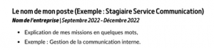 - Pour les expériences professionnelles, il est important d’indiquer : le nom de l’entreprise, le nom du poste que tu as occupé, les dates (début & fin) ainsi que quelques mots sur tes missions.